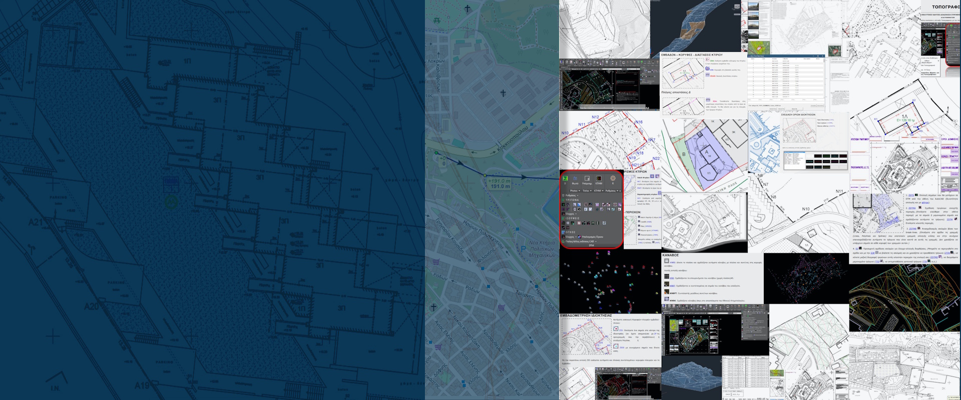 Σύνταξη πλήρους τοπογραφικού από την εισαγωγή σημείων στο σχέδιο ως την αυτόματη τελική εκτύπωση. ● Εισαγωγή σημείων ● σχεδίαση υφιστάμενης κατάστασης ● σήμανση κτιρίων ● hatch εδάφους και περιοχών ● σύμβολα ● ενδείξεις ● στάθμες ● κάναβος-σύστημα αναφοράς ● θεσμικές γραμμές ● πολεοδομικές ενδείξεις ● σχεδίαση ορίων ● τεκμηρίωση ιδιοκτησίας ● τεκμηρίωση κτιρίου ● αρτιότητα όμορων ● τίτλοι-δηλώσεις-όροι δόμησης ● αποσπάσματα εικόνων ● πίνακες συντεταγμένων ● πινακίδες εκτύπωσης ● εξαγωγή συντεταγμένων ● χιλιομέτρηση ● δασικά.